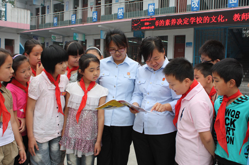 图为6月7日,该院选派的法制副校长一到县三街小学,就被热情的小学生围住,法官“副校长”现场为小学生讲起了司法小故事。