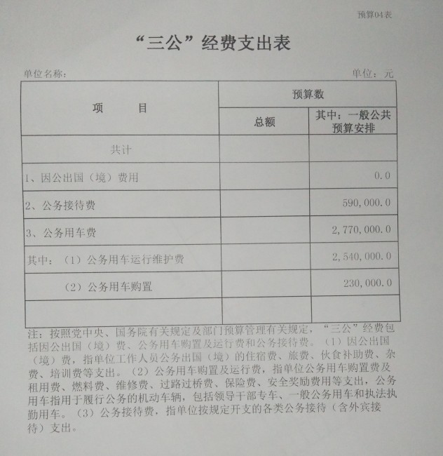 注:按照党中央、国务院有关规定及部门预算管理有关规定,“三公”经费包括因公出国(境)费、公务用车购置及运行费和公务接待费。(1)因公出国(境)费,指单位工作人员公务出国(境)的住宿费、旅费、伙食补助费、杂费、培训费等支出。(2)公务用车购置及运行费,指单位公务用车购置费及租用费、燃料费、维修费、过路过桥费、保险费、安全奖励费用等支出,公务用车指用于履行公务的机动车辆,包括领导干部专车、一般公务用车和执法执勤用车。(3)公务接待费,指单位按规定开支的各类公务接待(含外宾接待)支出。