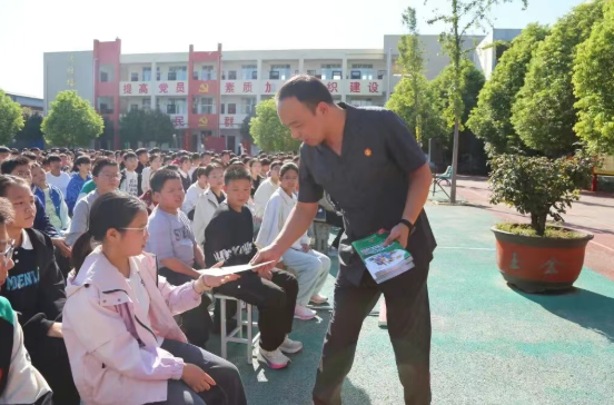 活动中,闫刚刚围绕校园霸凌、网络安全等常见问题,结合与校园生活高度契合的典型案例进行以案释法。他通过还原案情、解读法条、剖析后果,将抽象的法律条款转化为具体的生活警示,引导学生树立是非观、守住行为底线、自觉抵制不良行为。活动现场,干警们向学生分发了法治宣传手册,鼓励大家学法知法、树立规则意识、学会用法律武器保护自己。