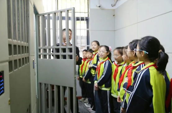上午9时,同学们在法院讲解员的带领下,有序参观了法院的安检区、诉讼服务中心、羁押室和审判法庭等场所。